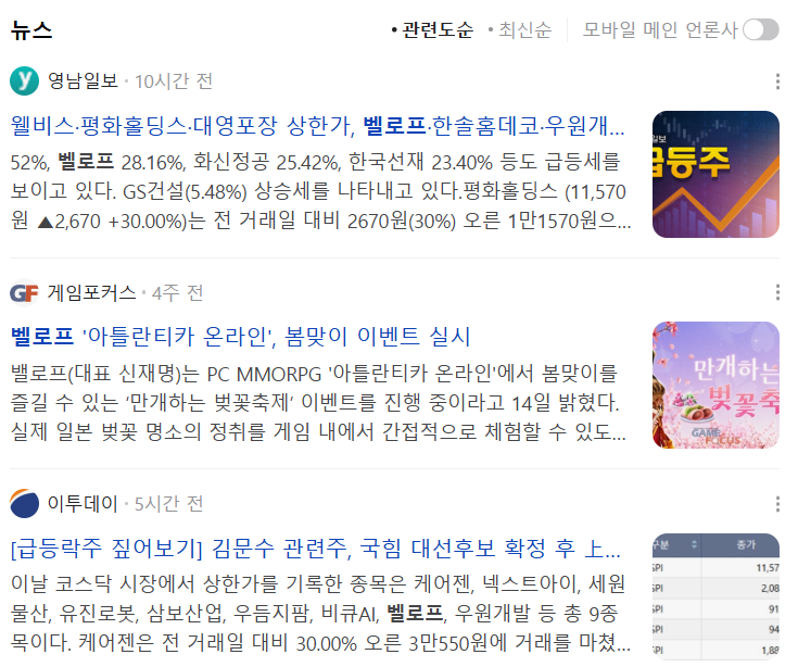 | 벨로프 | 821원 | +29.91% | 김문수 종친설 부각 |