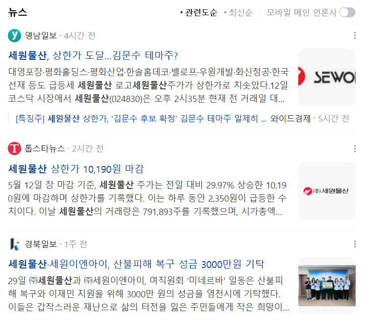 | 세원물산 | 10,190원 | +29.97% | 영천 지역 기반 제조업체 |