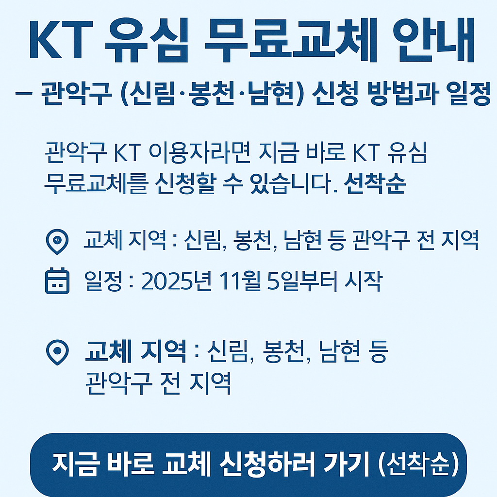 본 안내는 2025년 11월 초 기준 강서구 적용 정보를 바탕으로 작성되었습니다. 교체 일정과 세부 조건은 KT 공식 신청 페이지에서 반드시 확인하세요. 신청은 선착순으로 조기 마감될 수 있으니, 지금 바로 아래 버튼을 눌러 신청을 완료하세요.