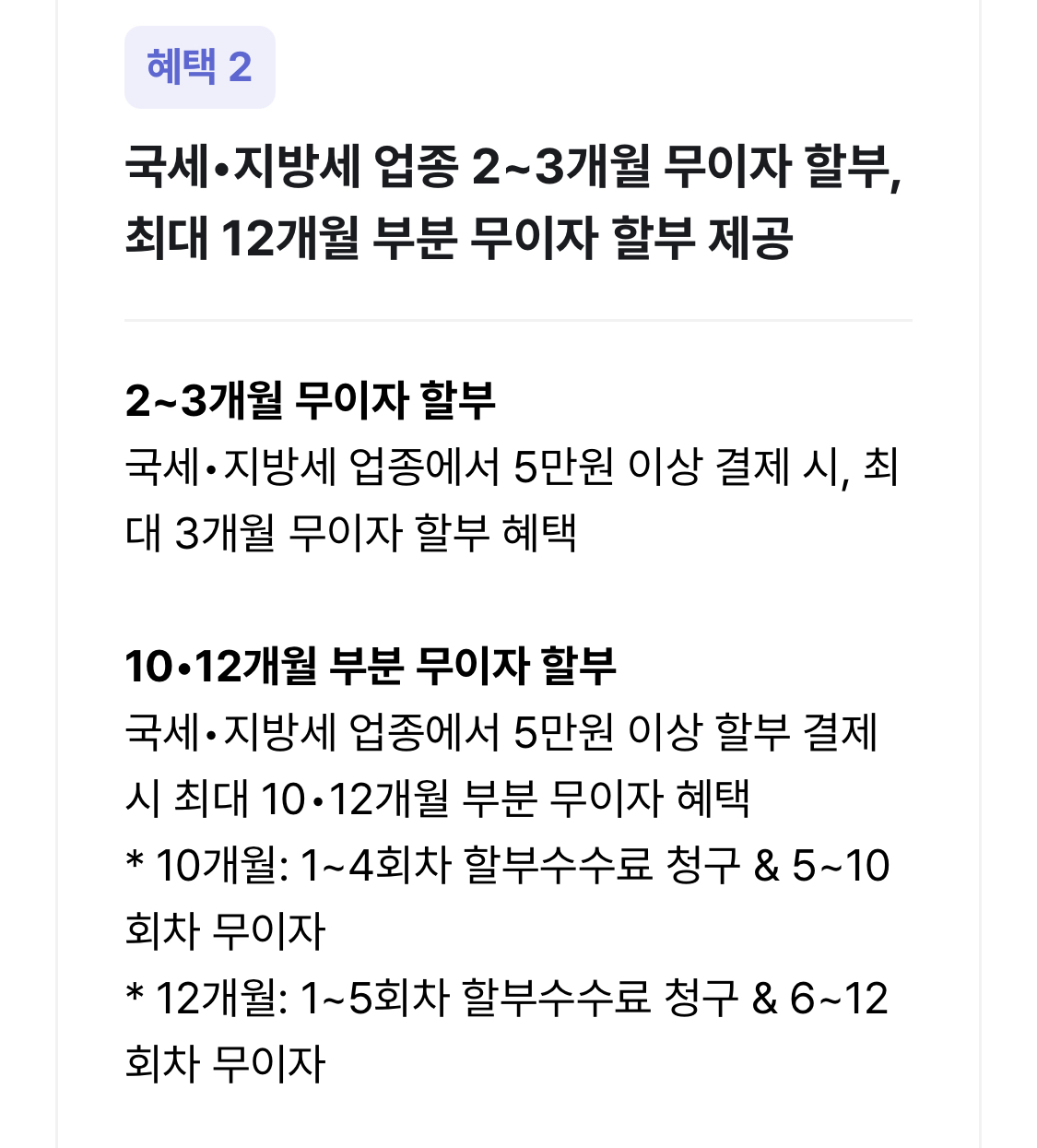 * 안내는 일반적인 예시이며, 카드사·납부 채널·금액에 따라 상이할 수 있습니다. 최종 조건은 결제 화면에서 확인하세요.
